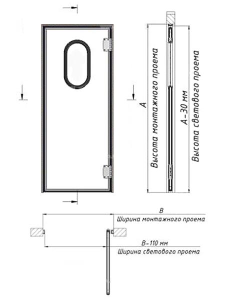 Пример для Маятниковой Двери Одностворчатой (с Фиксацией полотна), с Шириной монтажного проема 1200 мм, Высотой монтажного проема 2000 мм, стандартной толщиной полотна 40 мм, Правое открывание (петли справа):