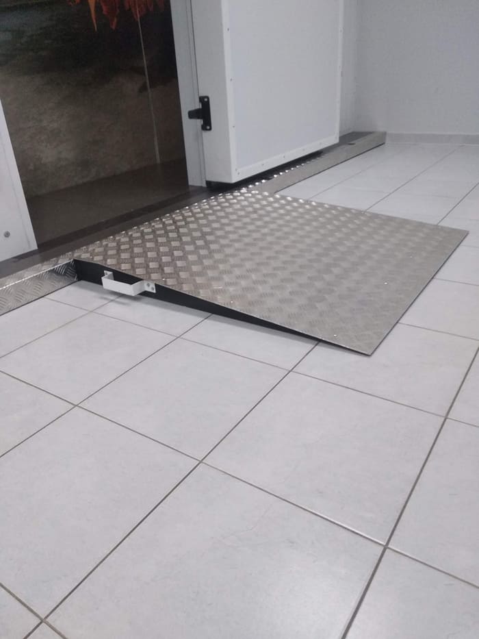 ПрофХолод производит пандусы двух типов: стационарный и накладной. Стационарный пандус устанавливается к дверям с безпороговой рамой. Накладной пандус оборудован дополнительными ручками, для удобства перемещения. В безпороговых низкотемпературных дверях в пандус монтируется ПЭН 40 Вт/м для предотвращения промерзания нижнего уплотнителя к снованию пандуса.