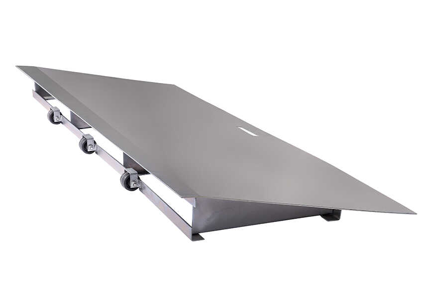 Конструкция пандуса позволяет легко перемещать его к дверному проему камеры за счет установленных с обратной стороны настила полиамидных роликов.