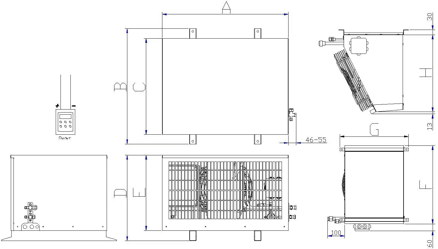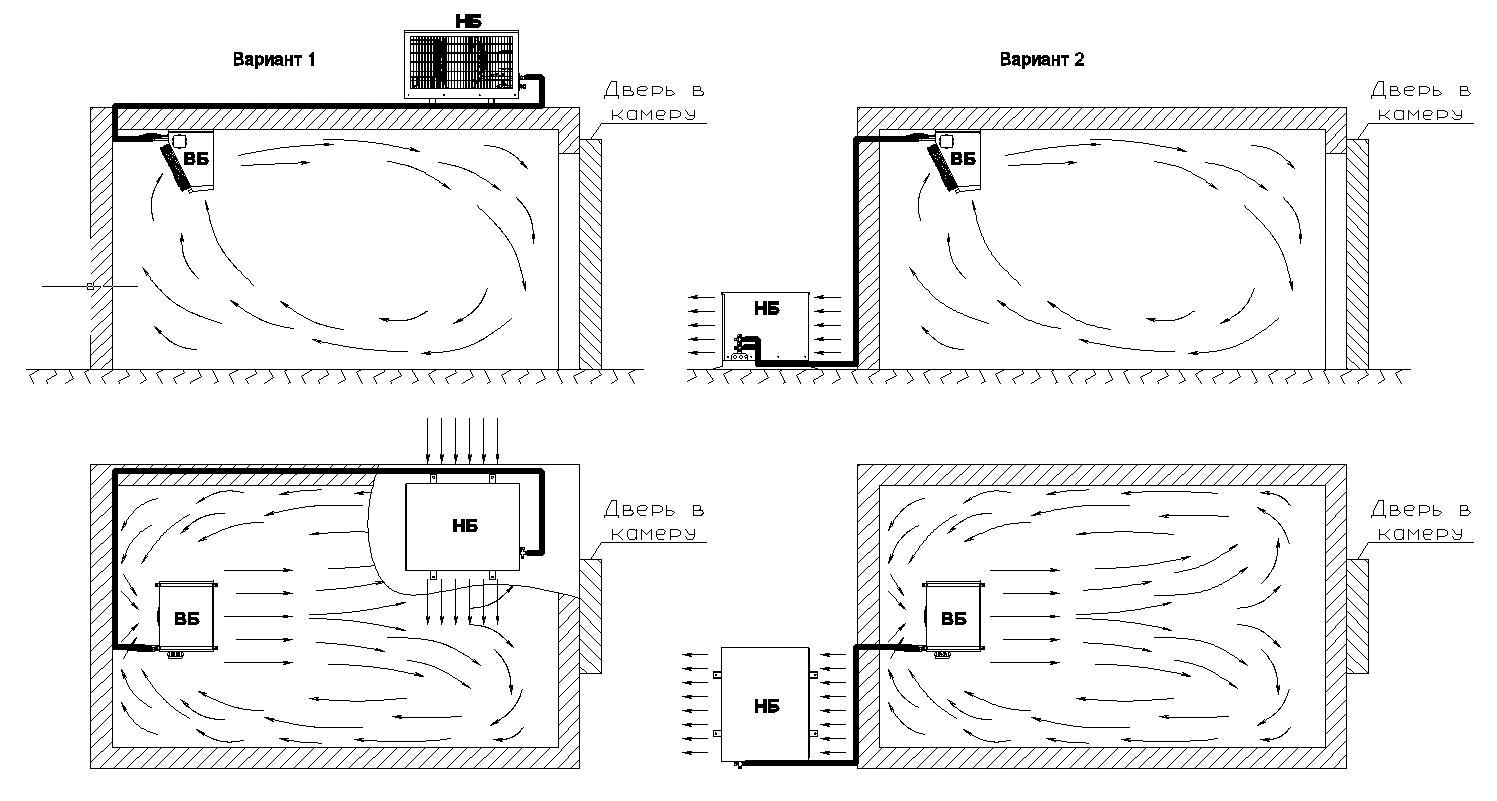 Наружный блок холодильной машины может быть установлен на холодильной камере (или на полу в малопыльном помещении) в сухом помещении при температуре окружающего воздуха от 12 до 40С и относительной влажности от 80 до 40% соответственно.