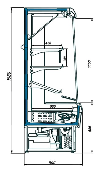 | Наименование | Температурный режим (°C) | Глубина выкладки (мм) | Глубина полки (мм) | Длина без боковин (мм) | Длина с боковинами (мм) | Ширина (мм) | Высота (мм) | Площадь выкладки (м2) | Полезный объём (м3) | Энергопотребление (кВт/сутки) |