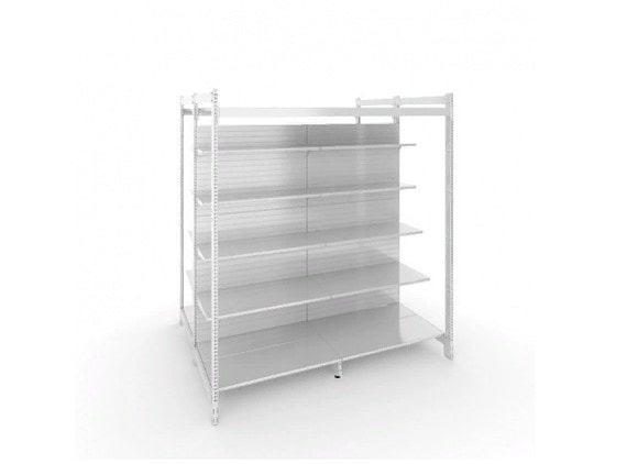 Комбинированная островная конструкция включает в себя 2 вида стеллажей - малый складской и торговый. Благодаря такому сочетанию стеллажи позволяют выложить товар для демонстрации и одновременно организовать хранение продукции.
