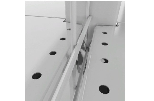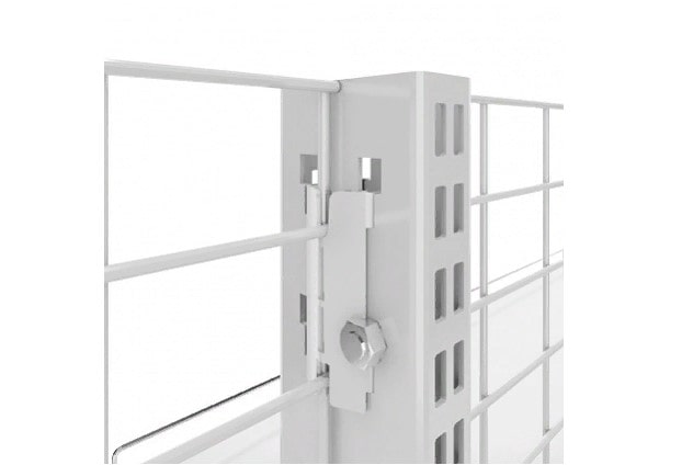 Сетчатая стенка позволяет выгодно демонстрировать товар на островных стеллажах и увеличивает обзорность товара, расположенного на рядом стоящих стеллажах. Соотношение диаметра проволоки к размеру и форме ячейки сетчатой стенки придает стеллажу своеобразный стиль, визуально облегчающий конструкцию. Кронштейн крепления сетчатой стенки предусматривает защиту от случайного съема, что будет неоспоримым преимуществом по отношению к традиционным стенкам, а жесткое сцепление стенки со стойкой ощутимо увеличивает устойчивость секции стеллажа в диагональном направлении.