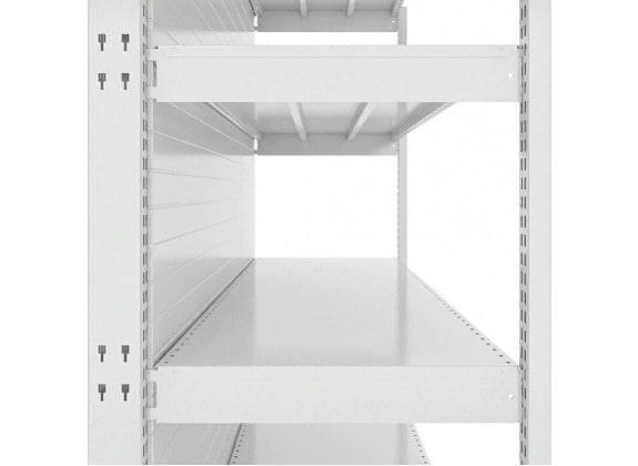 Стеллаж комплектуется усиленными двухсторонними полкодержателями нескольких типоразмеров, а также передними стойками с зацепами, которые устанавливаются в окна на торцах баз. Вспомогательным несущим элементом конструкции стала передняя стойка с замкнутым профилем 30х30 мм, что значительно увеличивает нагрузочные характеристики стеллажа с минимальным удорожанием конструкции.