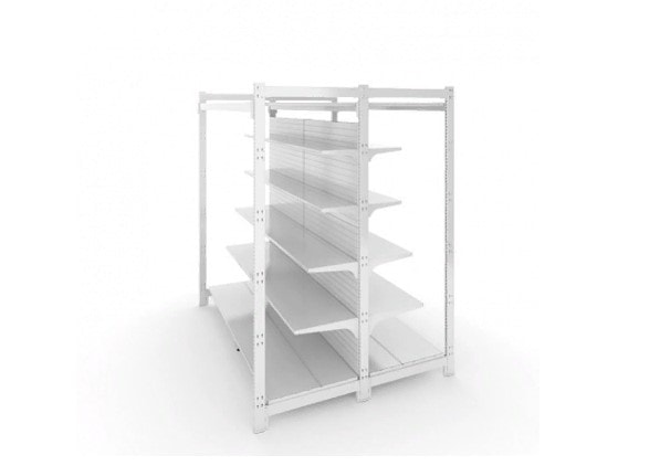 Комбинированная островная конструкция включает в себя 2 вида стеллажей - малый складской и торговый. Благодаря такому сочетанию стеллажи позволяют выложить товар для демонстрации и одновременно организовать хранение продукции.