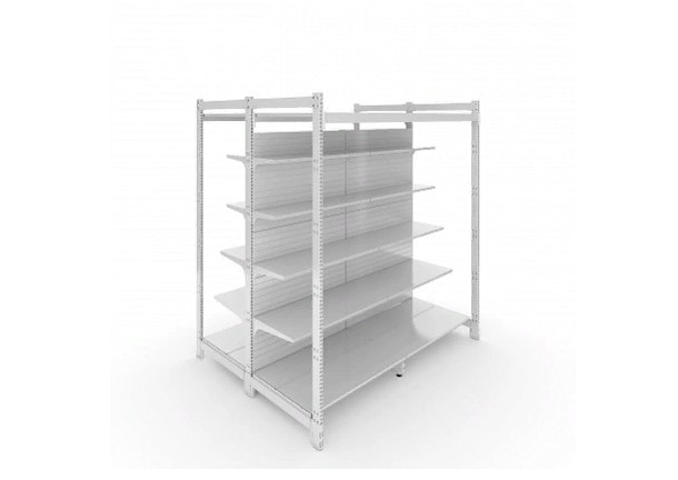 Комбинированная островная конструкция включает в себя 2 вида стеллажей - малый складской и торговый. Благодаря такому сочетанию стеллажи позволяют выложить товар для демонстрации и одновременно организовать хранение продукции.