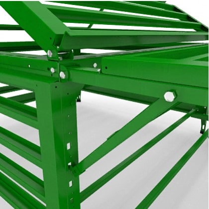Несущий каркас сочетает высокую жесткость и эстетичный внешний вид благодаря обшивке по углам декоративными элементами. В основе рамы заложены конструктивные элементы из металла толщиной 2 мм, скрепленные при помощи болтовых соединений М6 и М8 с использованием усиливающих раскосов и уголков. Преимуществом перед аналогичными моделями других производителей станет полная разборность конструкции и как следствие меньшая площадь занимаемого места и легкость при транспортировке.