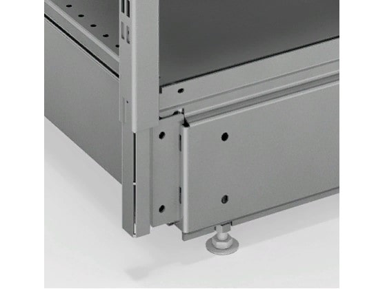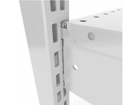 Стеллаж комплектуется усиленными двухсторонними полкодержателями нескольких типоразмеров, а также передними стойками с зацепами, которые устанавливаются в окна на торцах баз. Вспомогательным несущим элементом конструкции стала передняя стойка с замкнутым профилем 30х30 мм, что значительно увеличивает нагрузочные характеристики стеллажа с минимальным удорожанием конструкции.