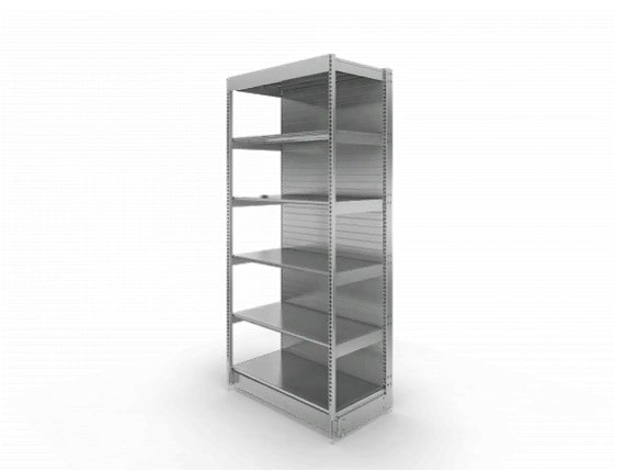 Стеллаж комплектуется усиленными двухсторонними полкодержателями нескольких типоразмеров, а также передними стойками с зацепами, которые устанавливаются в окна на торцах баз. Вспомогательным несущим элементом конструкции стала передняя стойка с замкнутым профилем 30х30 мм, что значительно увеличивает нагрузочные характеристики стеллажа с минимальным удорожанием конструкции.